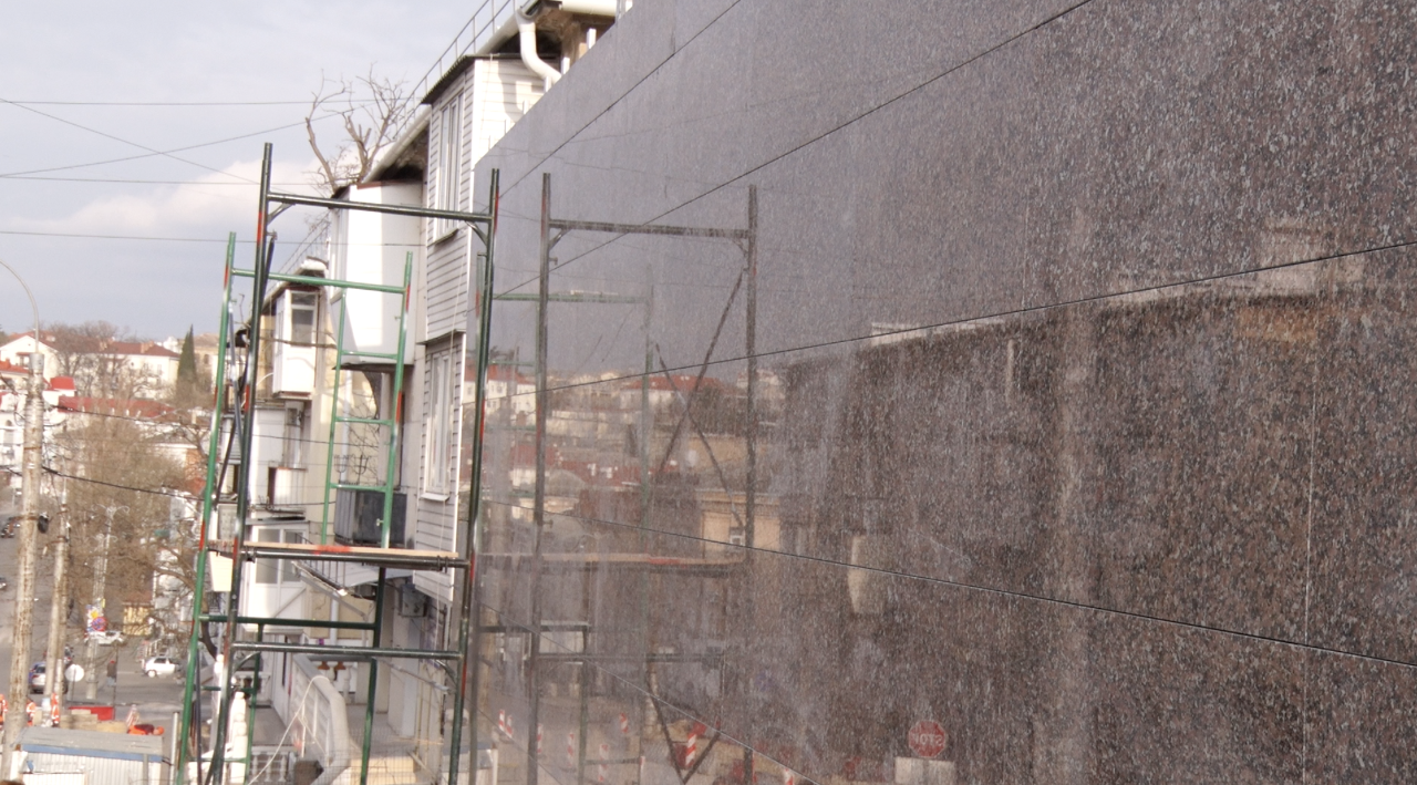 «Начали монтаж гранитной плитки на подсистему. Подсистема у нас нержавеющая. Монтаж плитки производится по месту. Плитка у нас гранитная, шлифованная, с глянцевой поверхностью. На сегодняшний день выполнено порядка 10% от общего объёма», — сообщил замначальника строительного управления АО «ВАД» по Севастополю Александр Куминов.