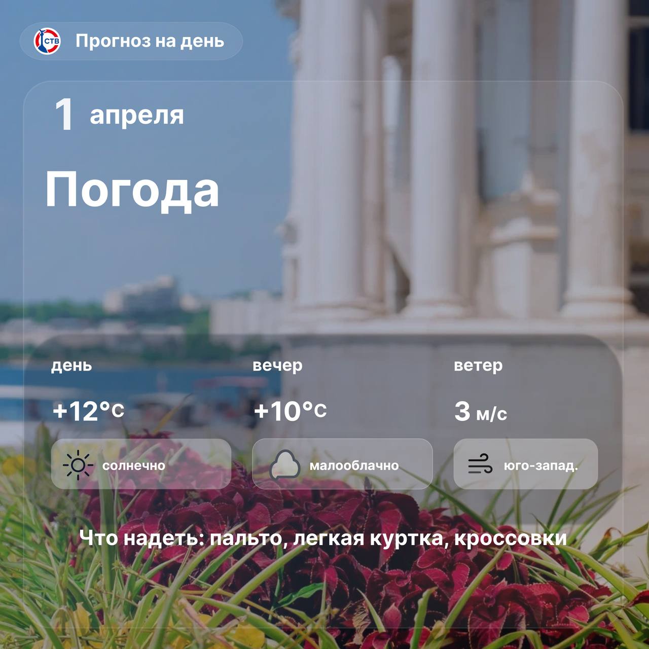 Сегодня в городе солнечно, воздух прогреется до +12°C. Несмотря на первое апреля, весна без шуток постепенно вступает в свои права. Пусть этот день пройдёт спокойно.