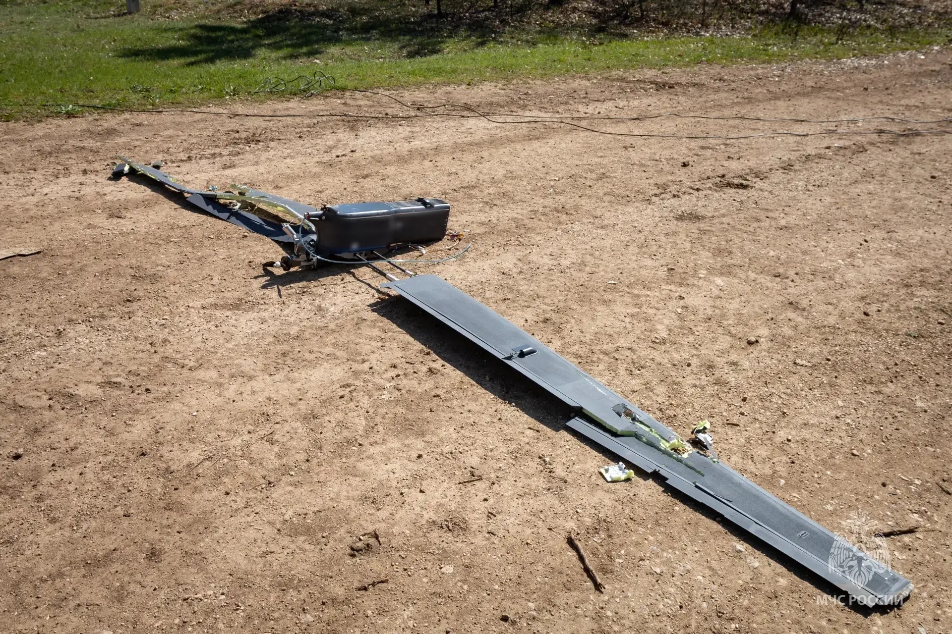 Части дрона упали на территорию во время вечерней атаки ВСУ 5 апреля. Специалисты МЧС России провели операцию по обезвреживанию. Жителей ближайших домов временно эвакуировали, на месте дежурили все экстренные службы.