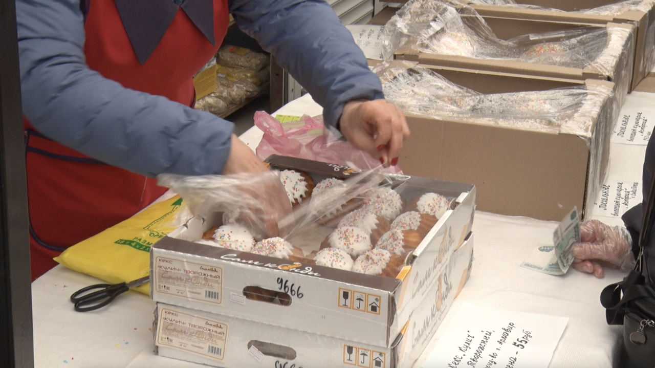 Уже можно купить свежие куличи, творожные пасхи и наборы для украшения яиц. Продавцы рассказывают: спрос начался ещё в начале недели. В ассортименте – классические ванильные куличи с изюмом и шоколадные.
