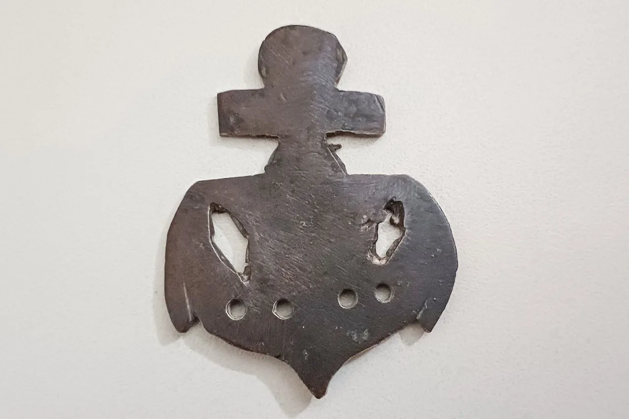 Она сделана вручную и так и осталась заготовкой. Видно, что на ней есть отверстия для крепежа: вероятно, хозяин хотел использовать её как накладку. Например, для пряжки поясного ремня или кокарды на головной убор. Такие самодельные предметы в народе называют «окопным творчеством». Бойцы делали их в перерывах между боями, сообщили в пресс-службе 35-й береговой батареи.