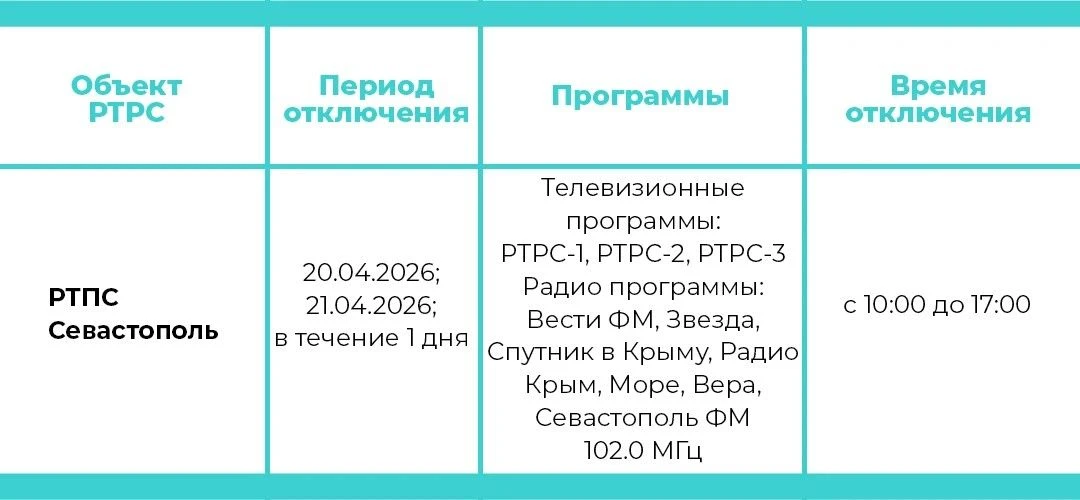 ВНИМАНИЕ. Технологические перерывы в трансляции телерадиопрограмм «На объектах филиала запланировано проведение работ на оборудовании вещания», — информирует филиал РТРС «РТПЦ Республики Крым»