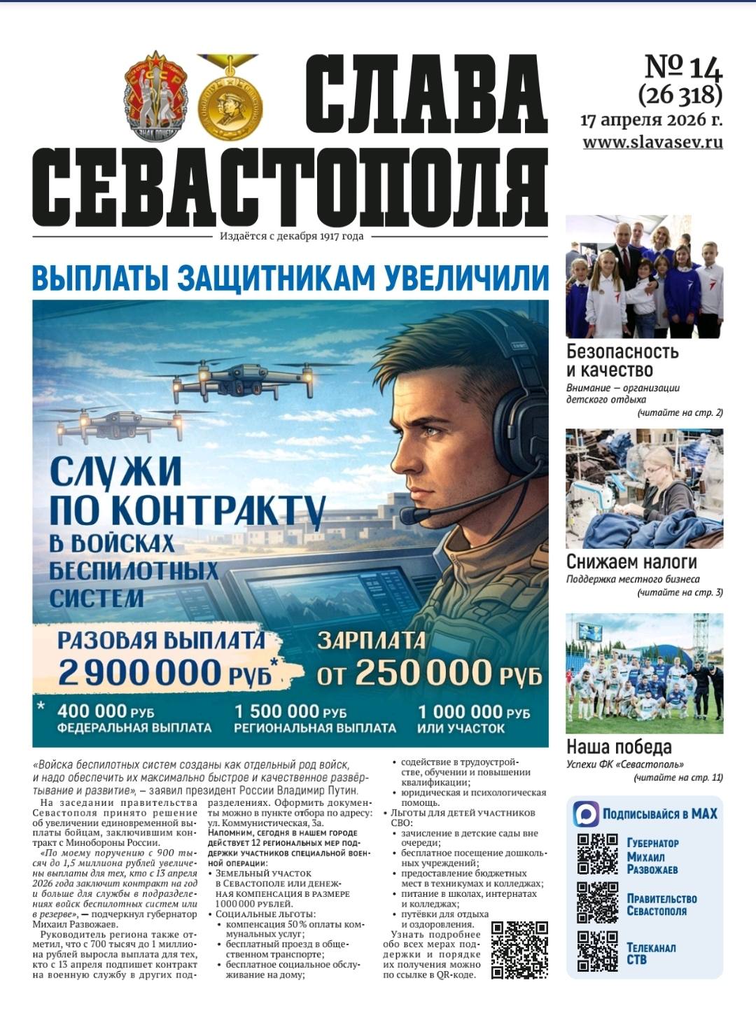 В нём – об увеличении единовременных выплат для бойцов, заключивших контракт с Минобороны РФ, инструкция о том, как принять участие в предварительном голосовании «Единой России», а также новости о развитии Севастополя.