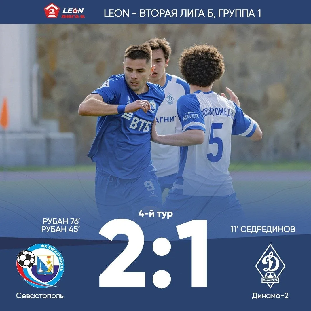 Матч с «Динамо-2» получился напряжённым с первых минут. Гости открыли счёт уже на 11-й минуте – 0:1. Севастопольцы активно шли вперёд и смогли сравнять на 45+1-й минуте: Станислав Рубан забил дальним ударом – 1:1. Во втором тайме наша команда полностью завладела инициативой, и на 76-й минуте Рубан оформил дубль – 2:1. До финального свистка счёт не изменился, победа за «Севастополем».