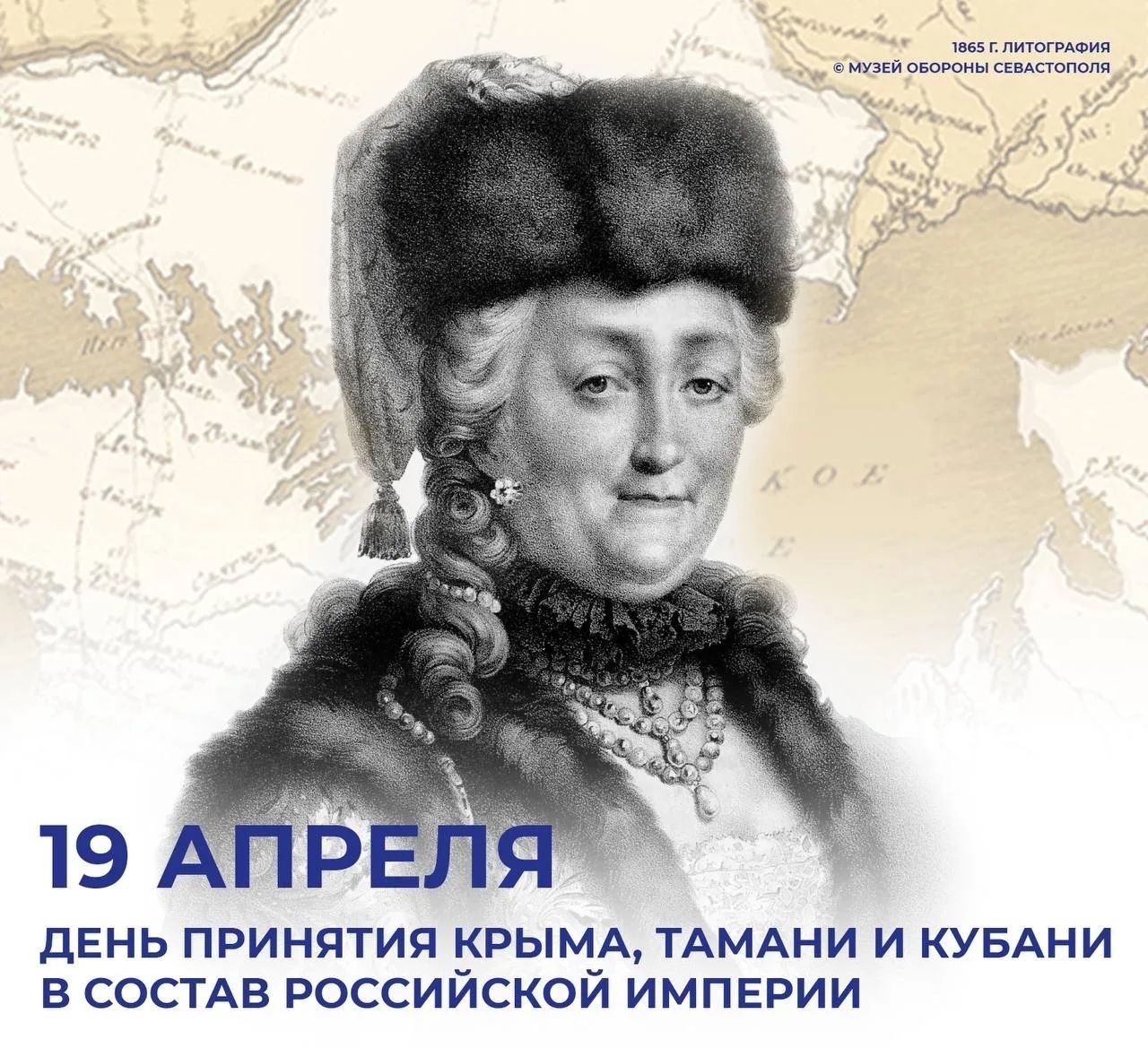 Сегодня мы вспомнинаем событие, навсегда изменившее судьбу нашего Отечества и народов, его населяющих. 19 апреля (8 апреля по старому стилю) 1783 года императрица Екатерина Великая подписала высочайший манифест о присоединении Крымского полуострова, Тамани и земель кубанских к Российской Империи.