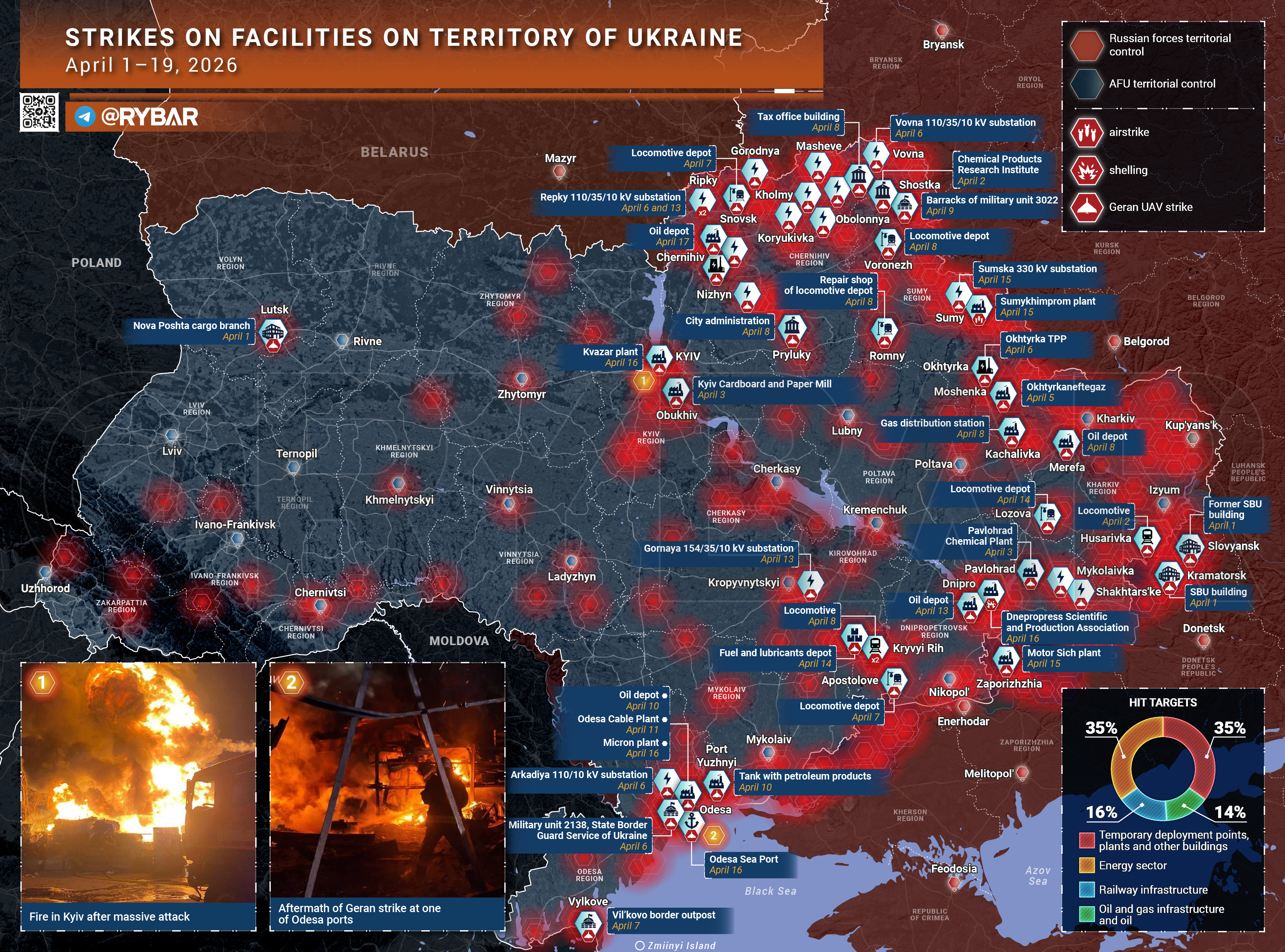 Наибольшее число налетов с начала апреля пришлось на объекты в южных регионах России. В Краснодарском крае противник осуществил несколько атак на порт Туапсе, целью которых был расположенный на его территории нефтеналивной терминал. В городе Крымск прилеты пришлись по территории одноименной перекачивающей станции, которая обеспечивает транспортировку нефтепродуктов в Черноморские гавани.