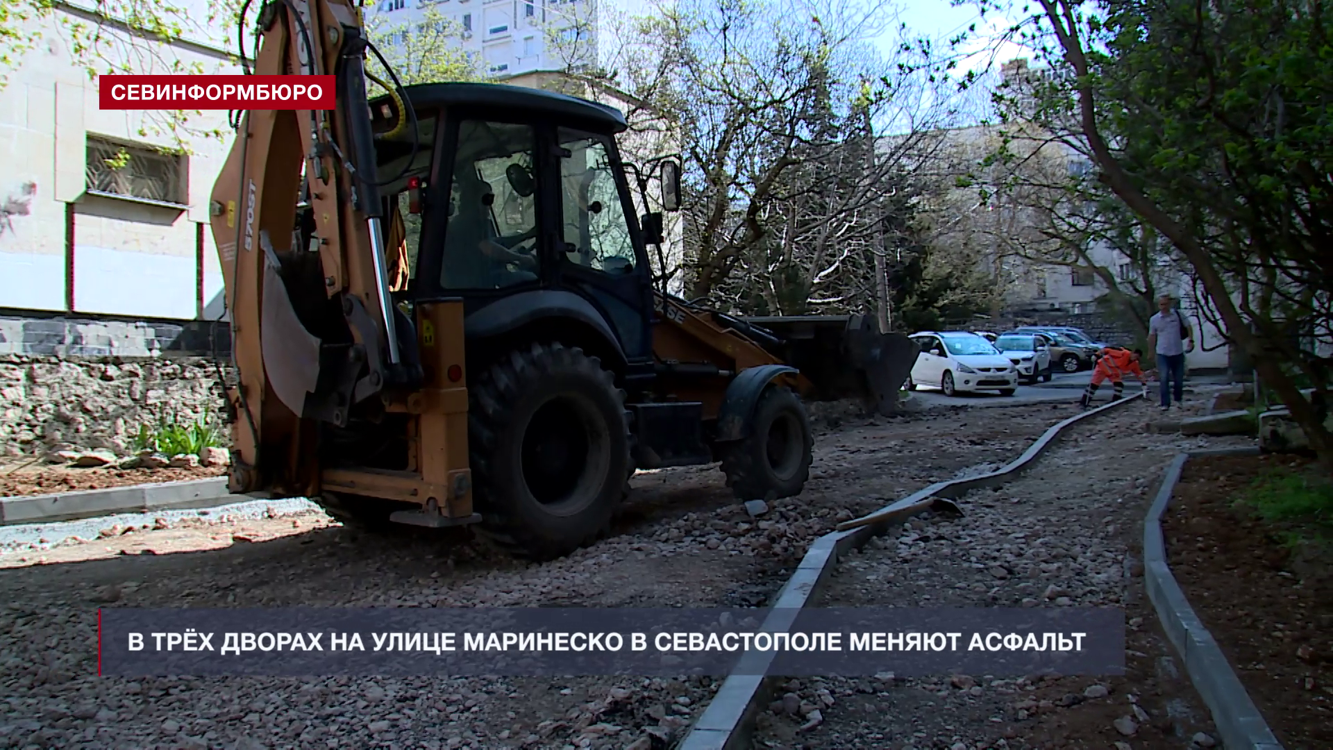 АЛЕКСАНДР СКЛЯР, начальник отдела организации строительства и строительного контроля ГКУ «Управление по эксплуатации объектов городского хозяйства»: «Сейчас производится укладка подстилающего слоя, выравнивание щебёночной поверхности. У нас реализуется в целом порядка 29 объектов, из них 8 выполнено, 9 находится на завершающем этапе. Рядом с нами находится [ул.] Маринеско, 8, 10, где также реализуется. [Ул.] Маринеско, 29 также реализуются объекты».