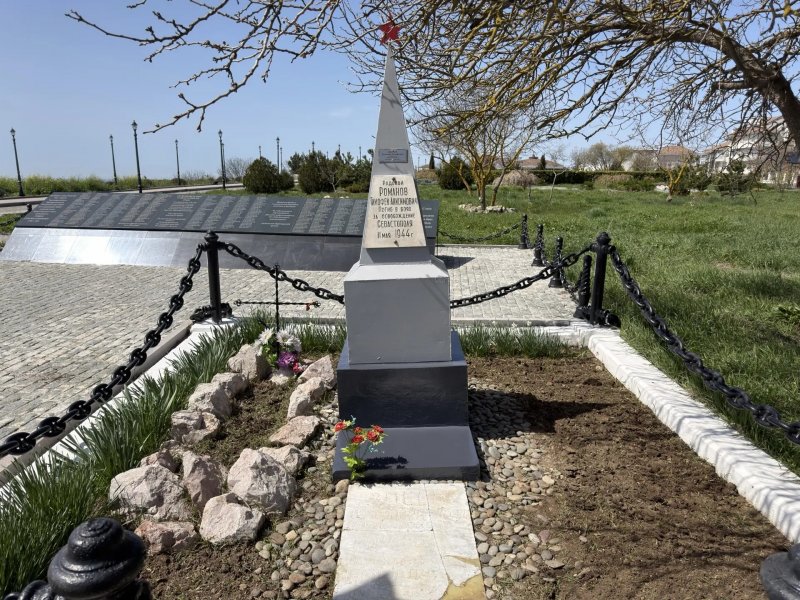 «Могила рядового Т.А. Романова, погибшего при освобождении Севастополя в 1944 году». Захоронение требует постоянного внимания: необходимо следить за порядком на прилегающей территории и поддерживать внешний вид надгробия.