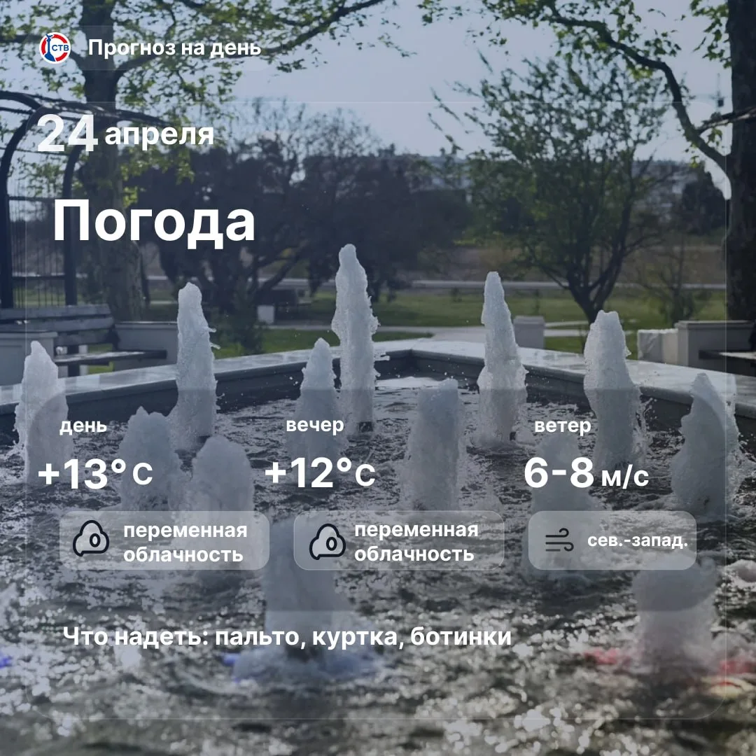 24 апреля в Крыму в силе штормовое предупреждение.В Симферополю переменная облачность. Ветер северо-западный 10-15 м/с. Температура воздуха днем +12…+14°.В Севастополе переменная облачность. Без осадков. Ветер северо-западный...