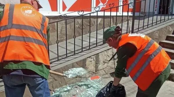 По словам губернатора, первым делом управляющие кампании начали подметать стекла во дворах, затягивать пленкой выбитые окна.