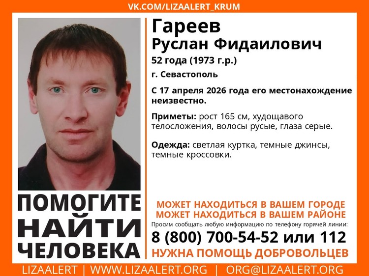 В поисковом отряде «ЛизаАлерт» Крым сообщили, что в 17 апреля 2026 года не удается установить местонахождение жителя Севастополя Гареева Руслана Фидаиловича, 1974 года рождения.