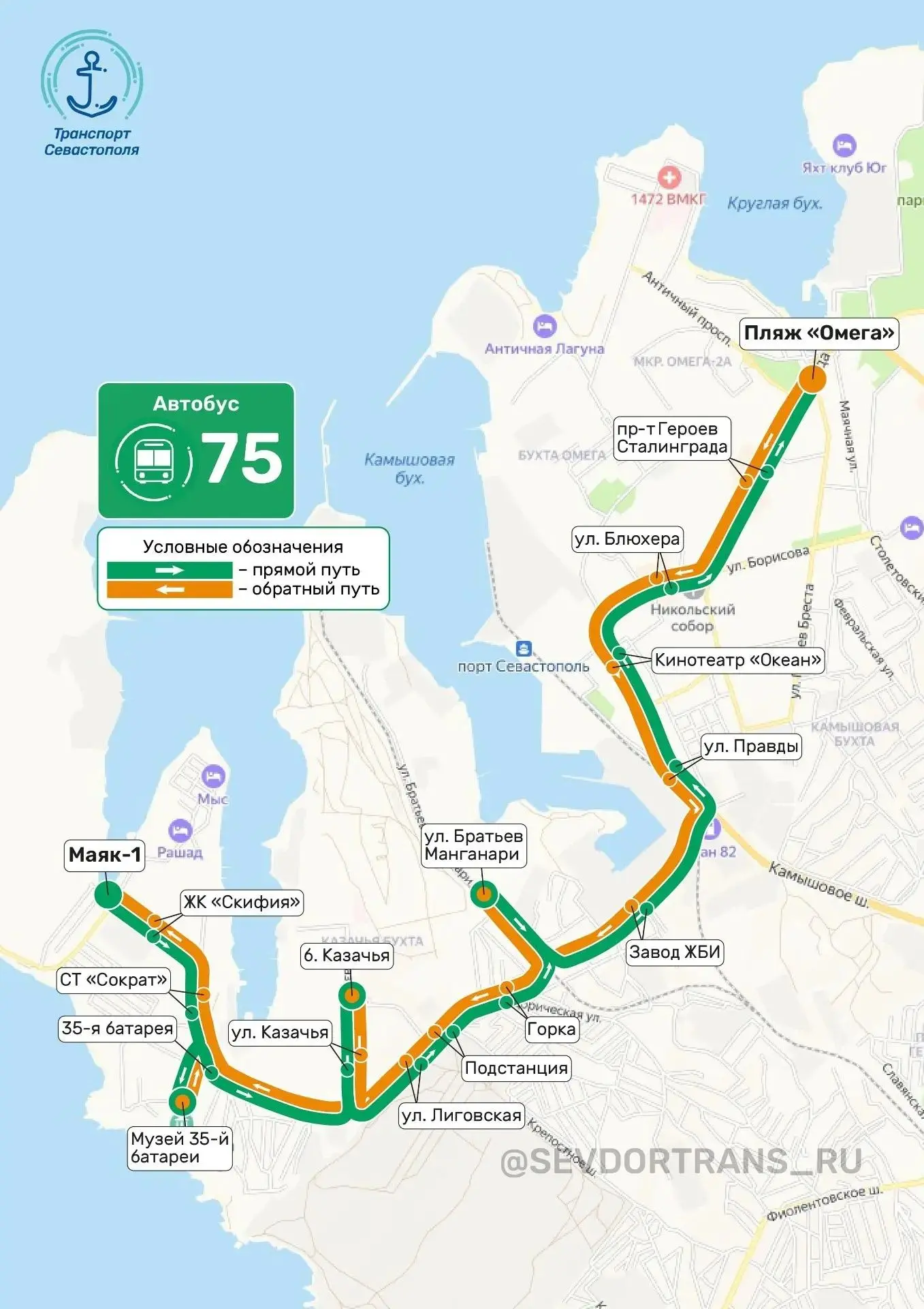 Маршруты «п. Кальфа — Маяк1» и «бухта Казачья — пляж Омега» теперь будут следовать с заходом на остановку «Музей 35й батареи» в прямом и обратном направлении. Об этом сообщили в дирекция по развитию дорожно-транспортной инфраструктуры Севастополя.
