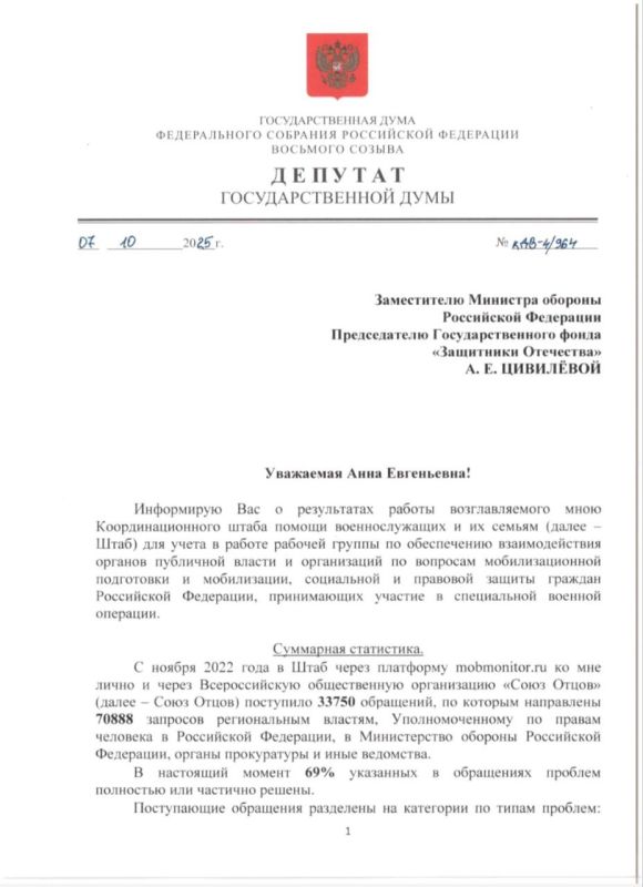 Отчёт по помощи участникам СВО и их близким федерального Штаба Захара Прилепина под моим руководством.1588 обращениях за отчётный месяц (всего 33750 шт).Общий "процент решаемости" 69%.Лучше всего решаются проблемы установления статуса военнослужащим, ...