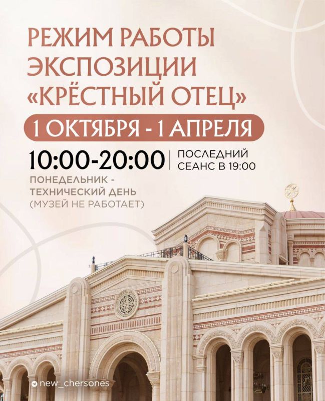 С 1 октября по 1 апреля музеи работают по следующему расписанию:Музей Христианства: с 10:00 до 20:00 (вход возможен до 19:00), понедельник — технический день.Музей Крыма и Новороссии: с 10:00 до 20:00 (вход возможен...